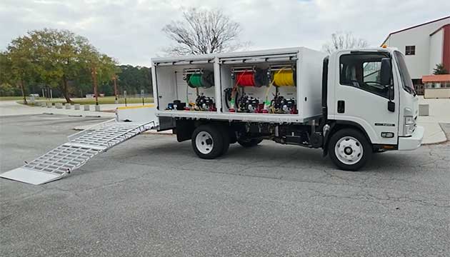 Look at this custom-built 400/200/200 Semi-Enclosed Truck, designed to deliver performance and reliability. Equipped with three pumps, reels, and engines to prevent cross-contamination, it also features a convenient side ride-on ramp, backup camera, and additional premium amenities.